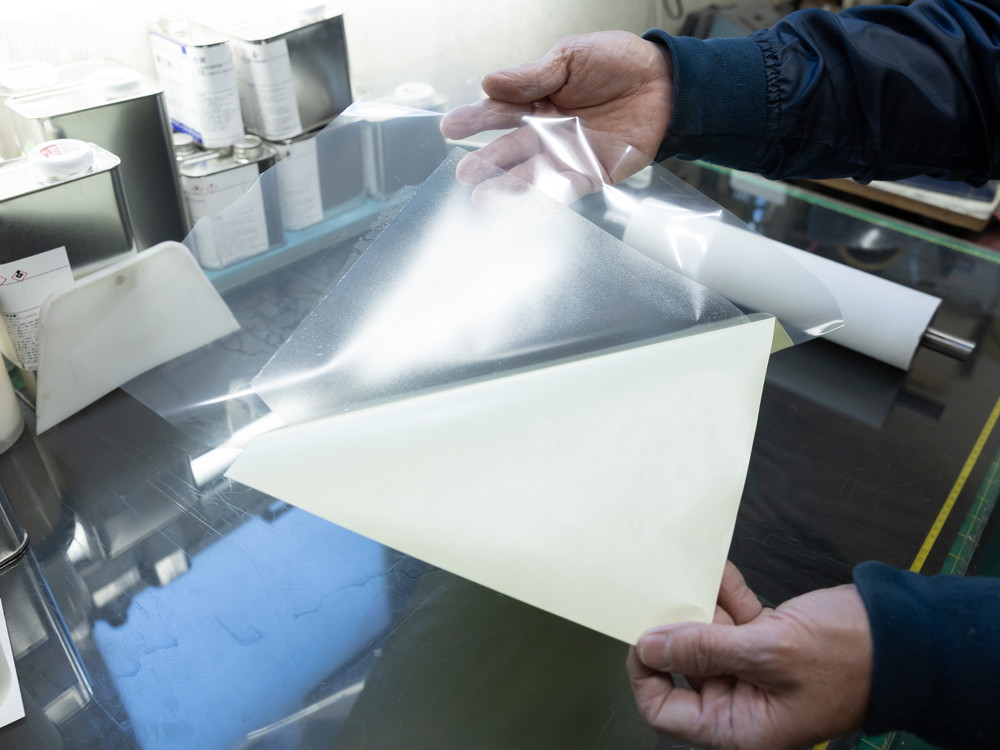 選定した素材でハンドサンプルを作成し、感触・貼り心地・剥がし具合などを確認します。実際の使われ方を想定しながら、調整していきます。